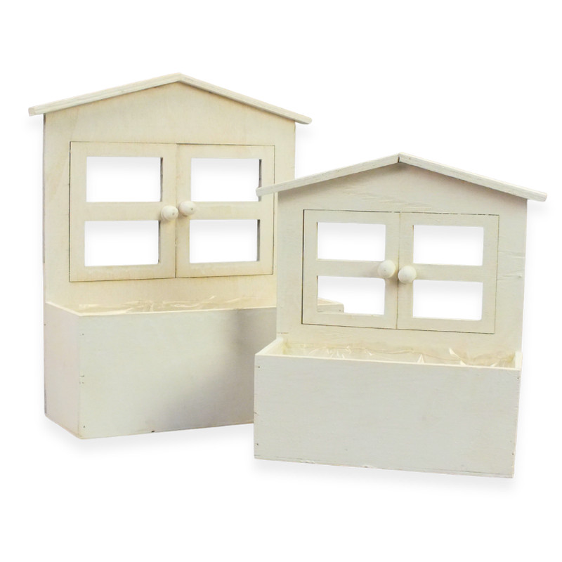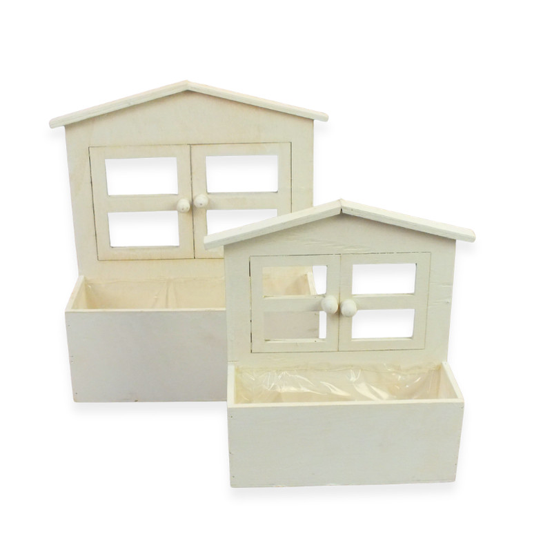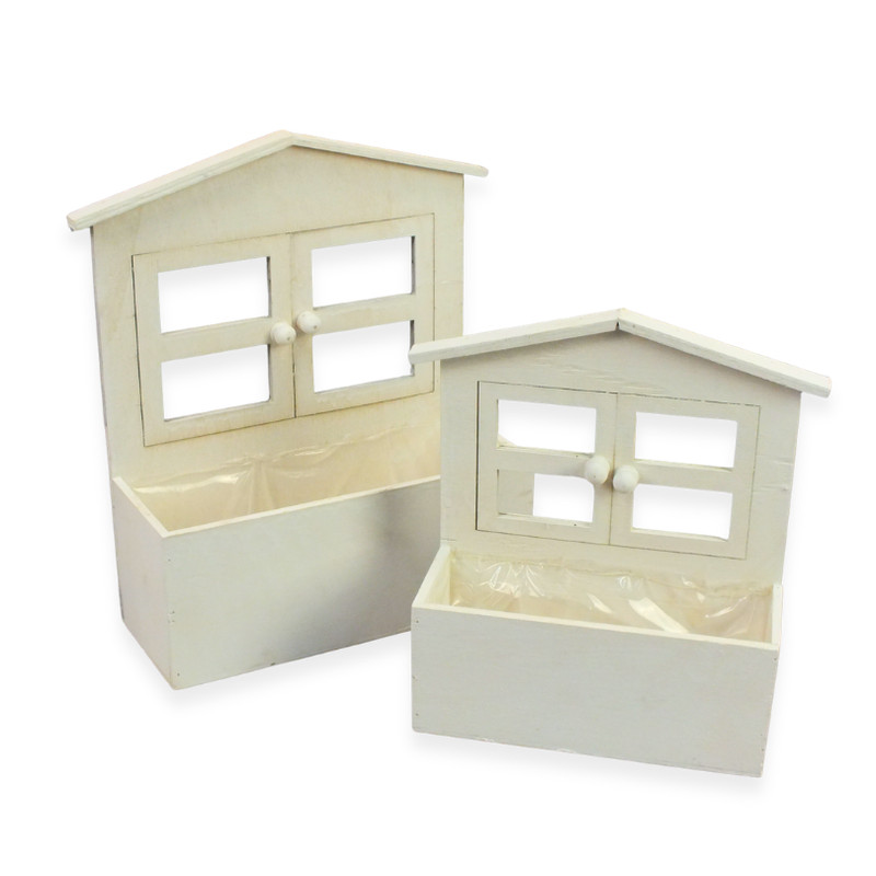 Az Ablakos bélelt fa virágtartó szett fehér 2db/szett különleges, házikó jellegű kialakításával igazán egyedi dekorációs alap. Az ablakos rész kedves, otthonos hangulatot teremt, mintha egy kis ház homlokzata jelenne meg a kompozícióban, így már önmagában is figyelemfelkeltő elem. A letisztult fehér szín könnyen kombinálható más dekorációkkal, ezért sokféle stílushoz jól illeszkedik. A szett két különböző méretű tartót tartalmaz, amelyek együtt és külön-külön is felhasználhatók. A bélelt belső résznek köszönhetően alkalmas virágokhoz, tűzőhabhoz vagy ajándék összeállításokhoz, így könnyedén készíthetők benne kreatív és látványos dekorációk. Ideális választás asztaldíszekhez, szezonális kompozíciókhoz vagy ajándékok mellé, ahol egy kis meghitt, „otthonos” hangulatot szeretnél megjeleníteni.