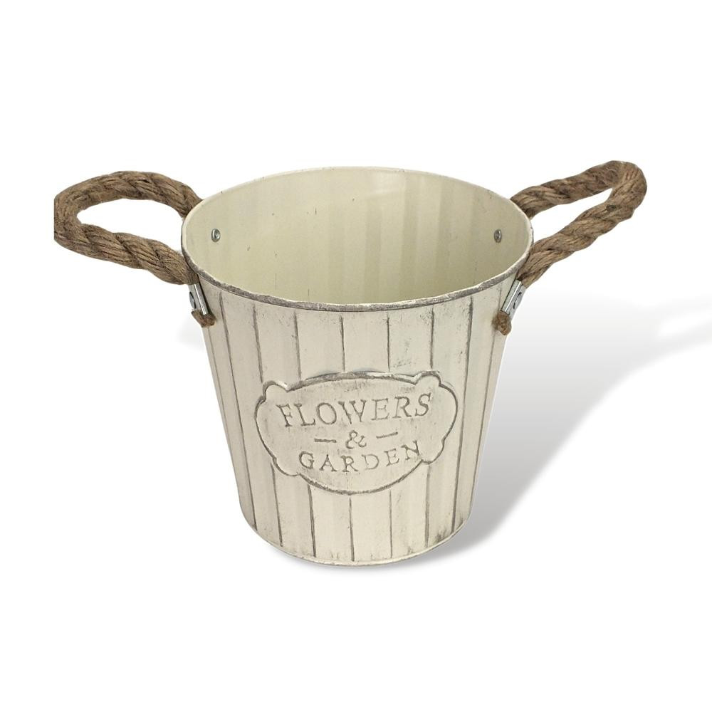 "Flowers & Garden" feliratos magasított bádog kaspó, kötél fülekkel.