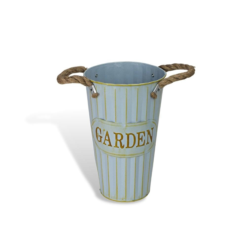 "Garden" feliratos magasított bádog váza, kötél fülekkel.