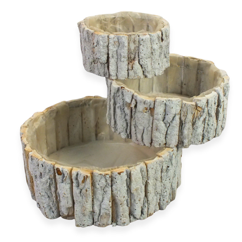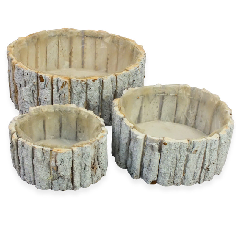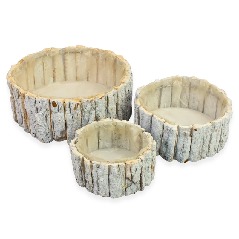 A fakéreg virágláda szett kerek fehér kivitelben természetes hatású, rusztikus megjelenésével igazán különleges dekorációs alap. A valódi fakéreg mintázat egyedi karaktert ad minden darabnak, míg a világos, fehér árnyalat könnyed, letisztult összhatást biztosít. A három különböző méretű, kerek forma harmonikus összeállítások készítését teszi lehetővé, így ideális választás virágkötőknek és otthoni dekorációkhoz is. A bélelt belső rész praktikus használatot biztosít élővirággal, tűzőhabbal vagy egyéb dekorációs elemekkel, így tökéletes asztaldíszekhez, ajándék kompozíciókhoz és szezonális dekorációkhoz.