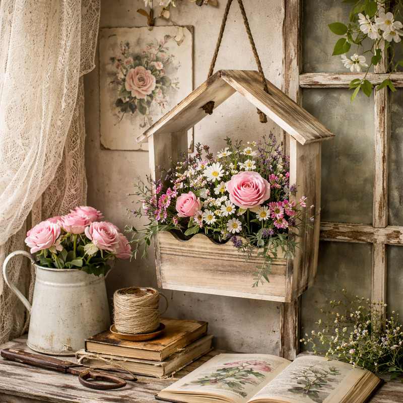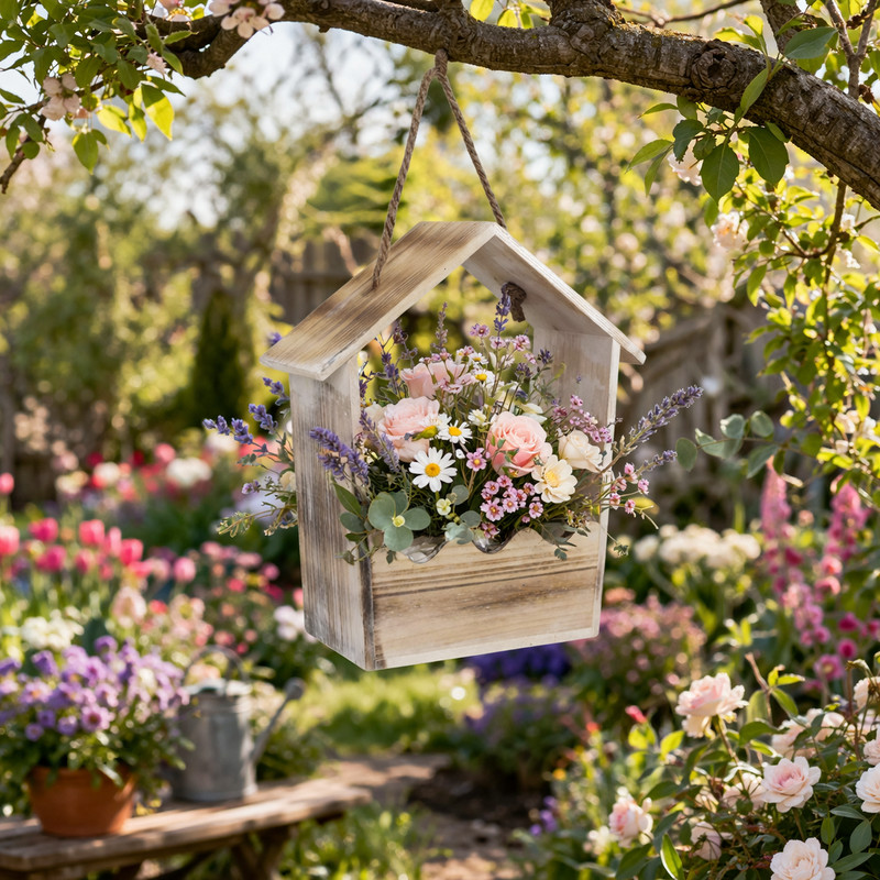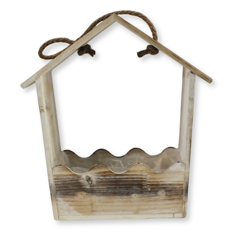 Az Íves tetejű zsinóros virágtartó 28x22x11 cm természetes hatású, dekoratív kiegészítő, amely különleges formájával emeli ki a kompozíciókat. A házikó jellegű kialakítás és a zsinóros akasztó praktikus és esztétikus megoldást kínál. Alkalmas virágokhoz, tűzőhabhoz vagy egyéb dekorációs elemekhez, így könnyen készíthető belőle ajtóra vagy falra helyezhető dísz. Ideális választás szezonális dekorációkhoz és ajándék kompozíciókhoz is.