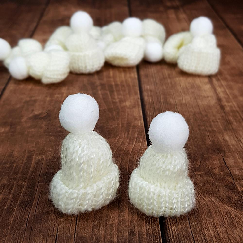 Aprócska kötött sapkák, pompom ladbával a tetején. Karácsonyi, téli dekorációkhoz, készítményekhez. Pl.: karácsonyfadísz, asztalidísz vagy falidísz kiegészítőnek.