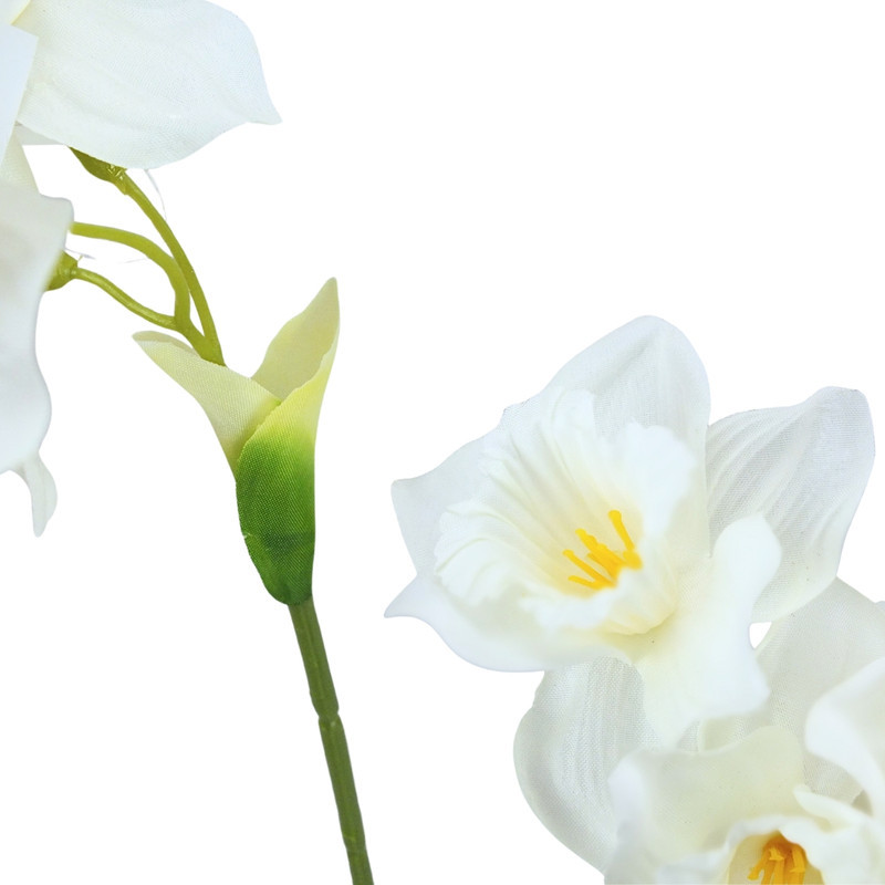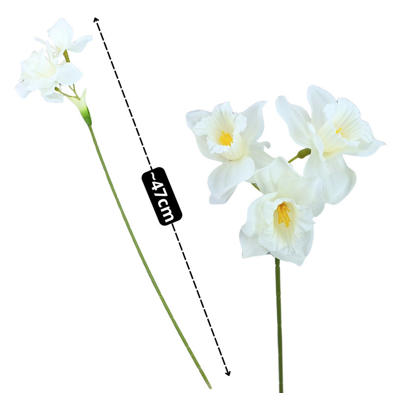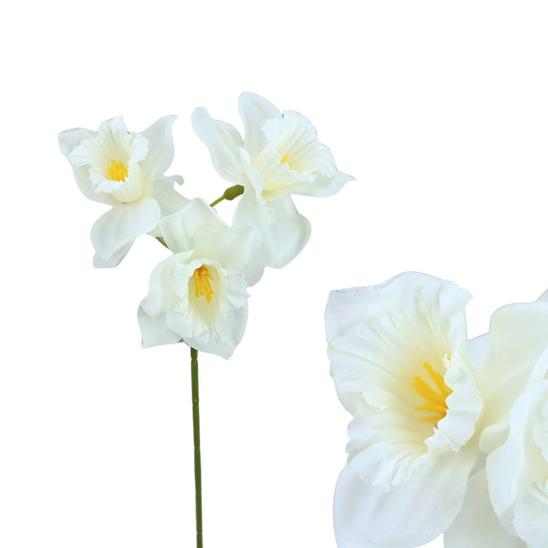 1 szál nárcisz, nyitott virágfejű, élethű megjelenésű, formázható műanyag szárral. Ideális választás vázákba, koszorúkhoz, ajtódíszekhez, csokrok kiegészítésére, vagy akár önálló dekorációként is. Kiváló minőségű anyagból készült, így tartós és sokoldalúan felhasználható.