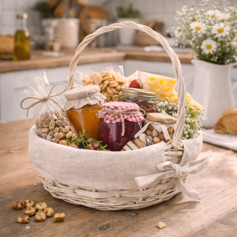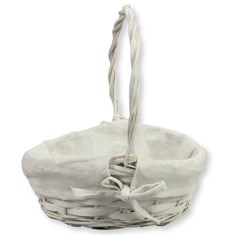 A Sziromszóró anyagos kosárka 20x18x22 cm romantikus és elegáns kiegészítő különleges alkalmakhoz. A fonott kosár és a textil bélés harmonikus, letisztult megjelenést biztosít.