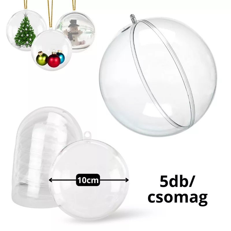 Karácsonyi és egyéb szezonális ünnepi dekorációkhoz. Akár ajándékot is lehet belőle készíteni, vagy azt elrejteni benne. A műanyag összepattintható gömb nélkülözhetetlen kelléke a saját készítésű egyedi karácsonyfadíszek elkészítéséhez is. Méret: 10cm. Felhasználható karácsonyi koszorúba, asztaldíszbe és dekorációba.