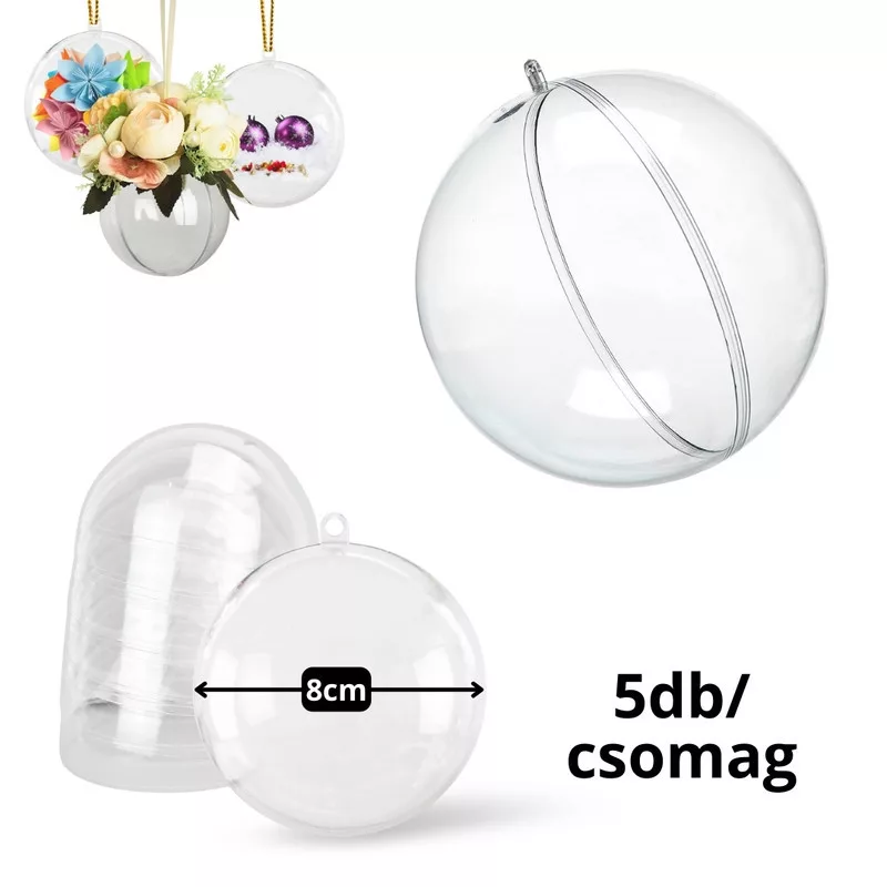 Karácsonyi és egyéb szezonális ünnepi dekorációkhoz. Akár ajándékot is lehet belőle készíteni, vagy azt elrejteni benne. A műanyag összepattinthatós gömb nélkülözhetetlen kelléke a saját készítésű egyedi karácsonyfa díszek elkészítéséhez is. Méret: Átmérő: 8cm. Felhasználható karácsonyi koszorúba, asztaldíszbe és dekorációba.