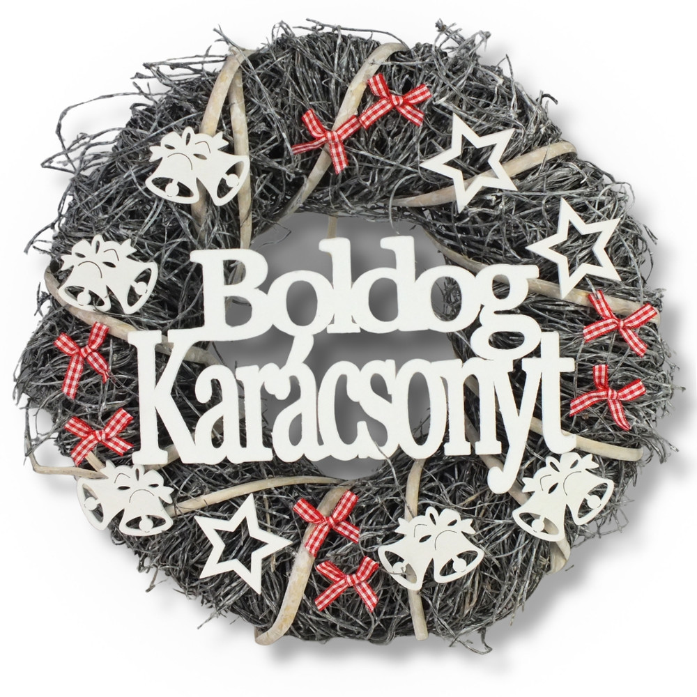 Ajtókopogtató "Boldog Karácsonyt" szürke 30cm – koszorúkészítéshez és ajtódíszhez