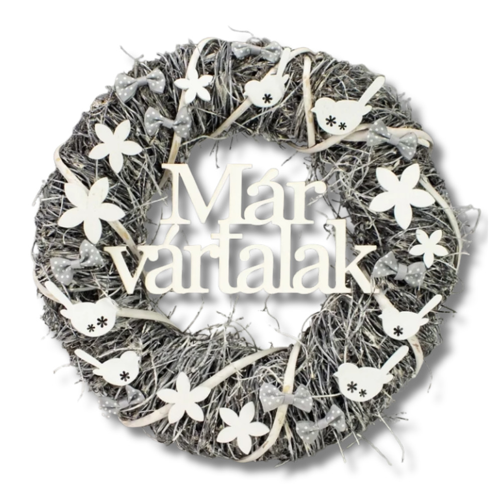Üdvözöld a vendégeket a "Már vártalak" felirattal díszített szürke ajtókopogtató koszorúval! Ez a bájos és egyedi dekorációs elem tökéletes választás, hogy üdvözölj mindenkit otthonod ajtajában. A koszorú anyaga minőségi és tartós, így hosszú évekig szép marad. A szürke szín elegáns és könnyen kombinálható más dekorációkkal.