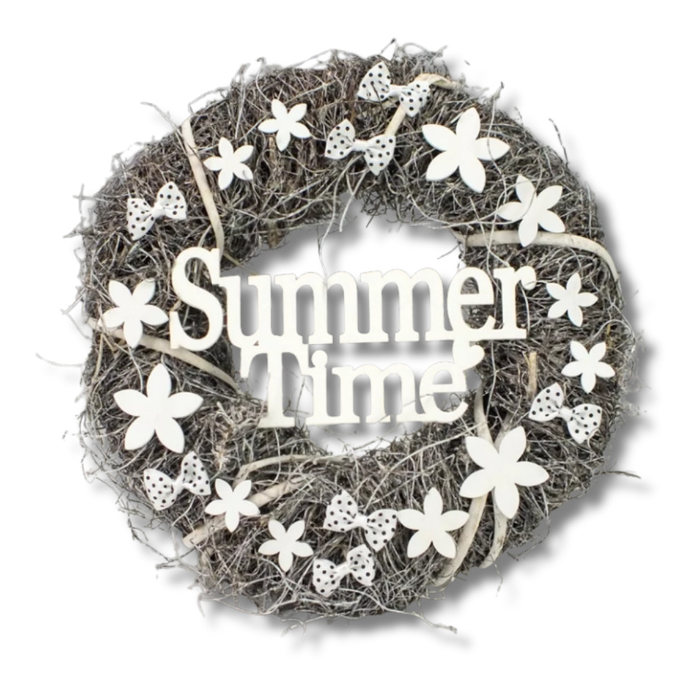 Üdvözöld a vendégeket a "Summer time" felirattal díszített szürke ajtókopogtató koszorúval! Ez a bájos és egyedi dekorációs elem tökéletes választás, hogy üdvözölj mindenkit otthonod ajtajában. A koszorú anyaga minőségi és tartós, így hosszú évekig szép marad. A szürke szín elegáns és könnyen kombinálható más dekorációkkal.