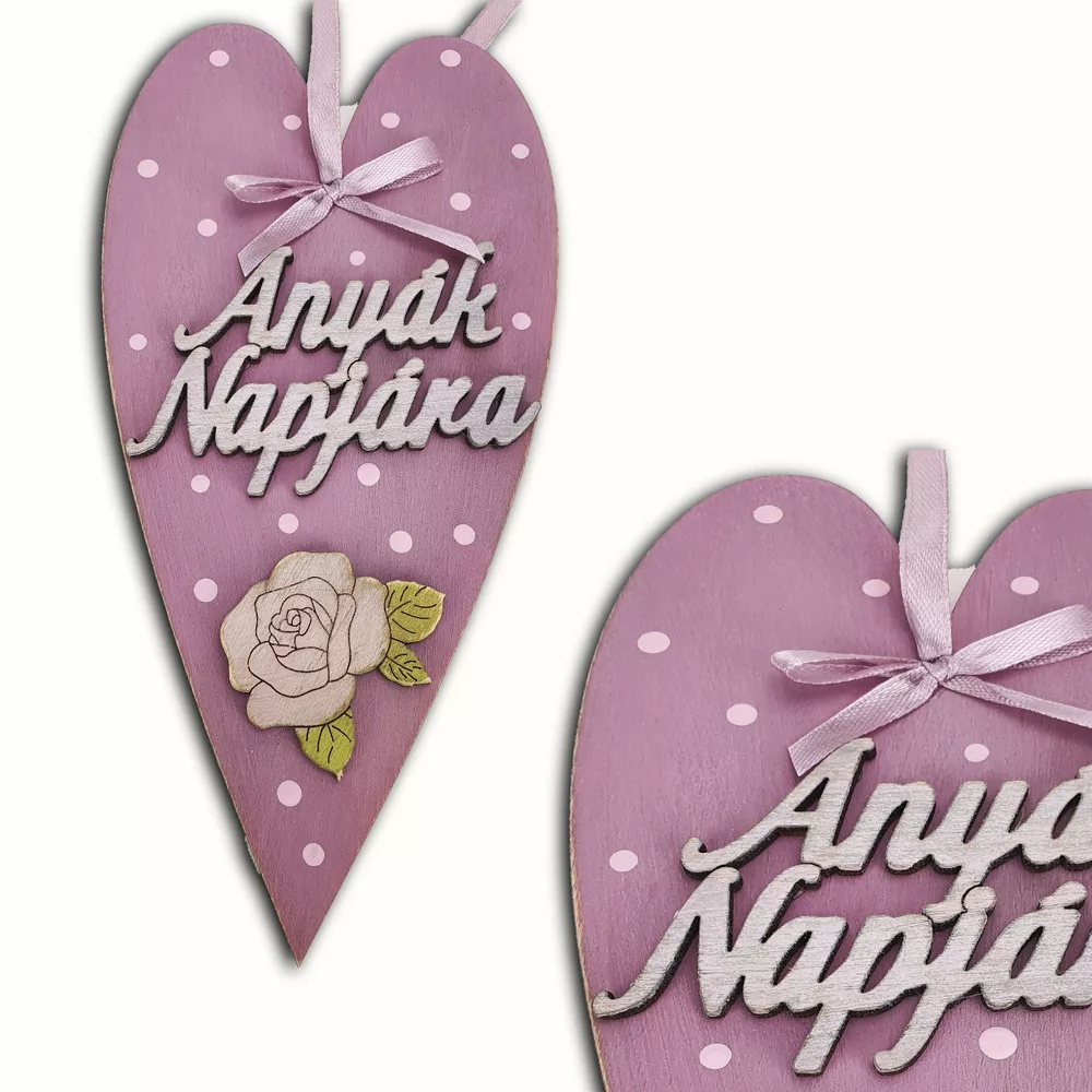 Anyák napja alkalmából ezzel az ajándékkal szeretnénk kifejezni az anyukák mindennapos törődését és szeretetét. Anyák napi díszített szív fából, felakasztható, "Anyák napjára" felirattal.Méret:10x20cm. Felhasználható anyák napi ajándékhoz és ünnepi dekorációhoz.