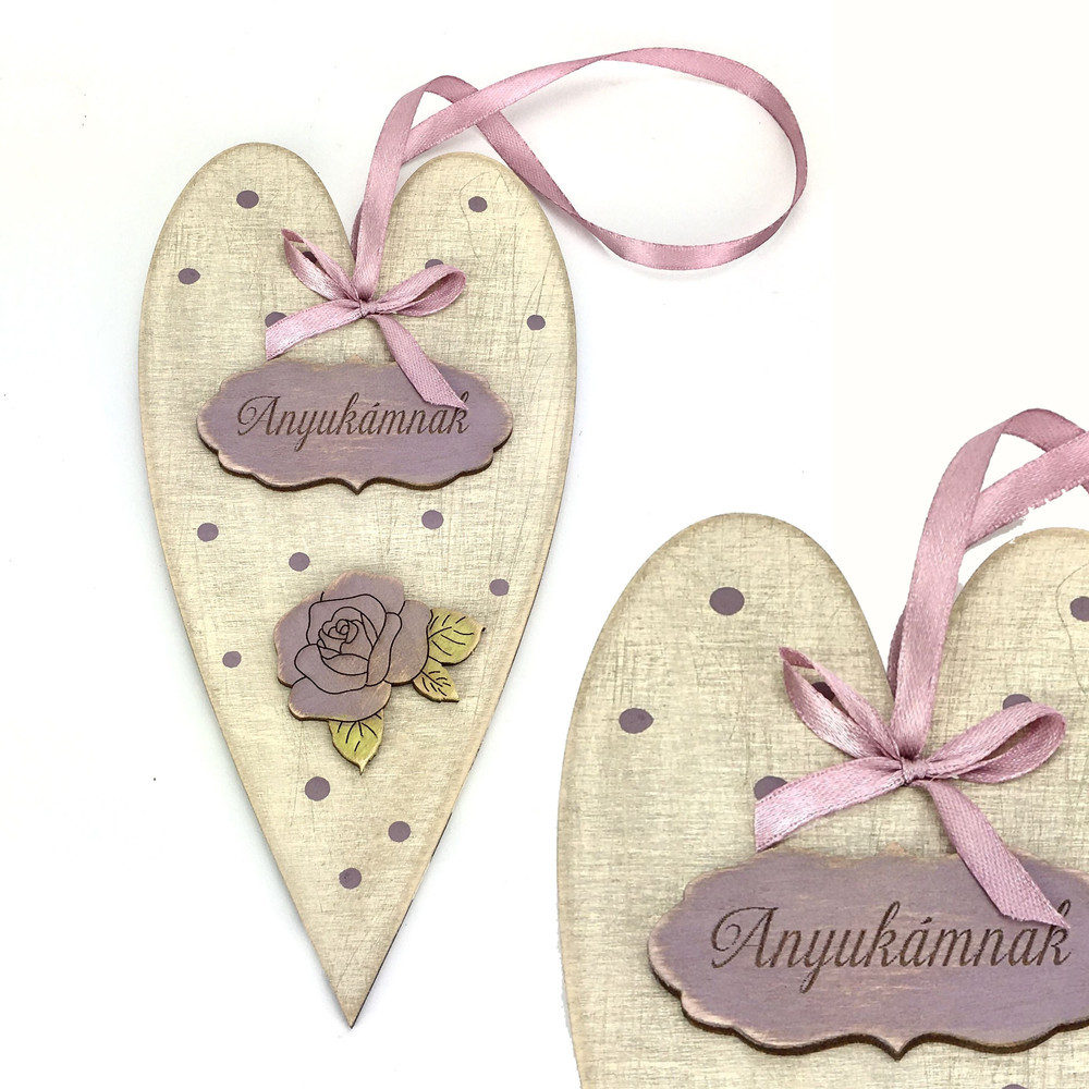 Lepjük meg vagy ajándékozzuk meg az anyukákat, hogy kifejezzükhálánkat a mindennapos törődésért és önzetlen szeretetért.Anyák napi díszített szív fából, felakasztható, "Anyukámnak" felirattal.Méret:10x20cm. Felhasználható koszorúkészítéshez, ajtódísz és asztaldísz alapjának.