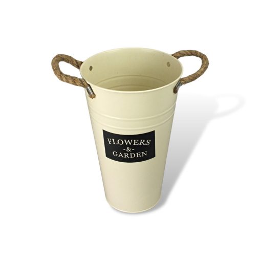 "Flowers & Garden" feliratos magasított bádog váza, kötél fülekkel. Strapabíró, nagyobb csokrokat is könnyen befogadó virágtartó.Méret: 19x30cm, talp átmérő: 12cm, tető átmérő: 19cm. Felhasználható tároláshoz, virágcserép fedéshez és lakásdekorációhoz.