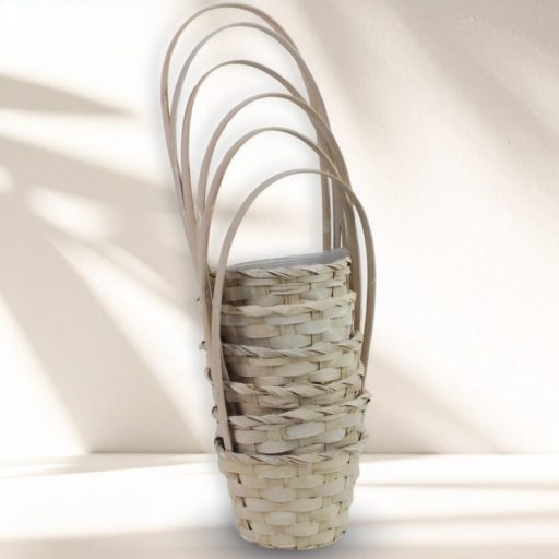 A mosott fehér bambusz füles kaspó 12 cm méretben, 6 darabos csomagban praktikus és dekoratív választás élő vagy művirágok elhelyezéséhez. Természetes anyaga és finoman fehérített felülete letisztult, világos megjelenést kölcsönöz a dekorációnak. Erős kosárfülének köszönhetően könnyen mozgatható és akasztható. Ideális tavaszi, húsvéti vagy egész éves díszítéshez, valamint ajándékkosár alapjaként is kiválóan használható.