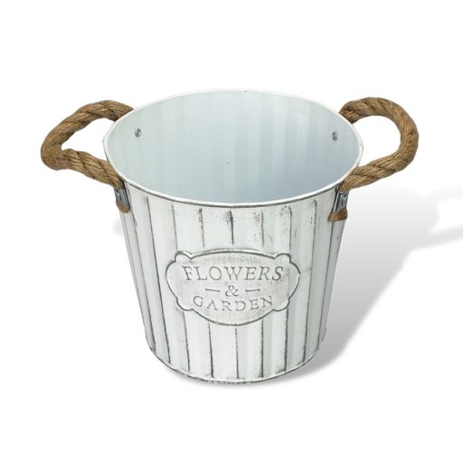 "Flowers & Garden" feliratos magasított bádog kaspó, kötél fülekkel. Strapabíró virágtartó bordázott oldallal, beltérre és kültérre egyaránt.Méret: 18x16cm, talp átmérő: 14cm, tető átmérő: 18cm. Felhasználható tároláshoz, virágcserép fedéshez és lakásdekorációhoz.
