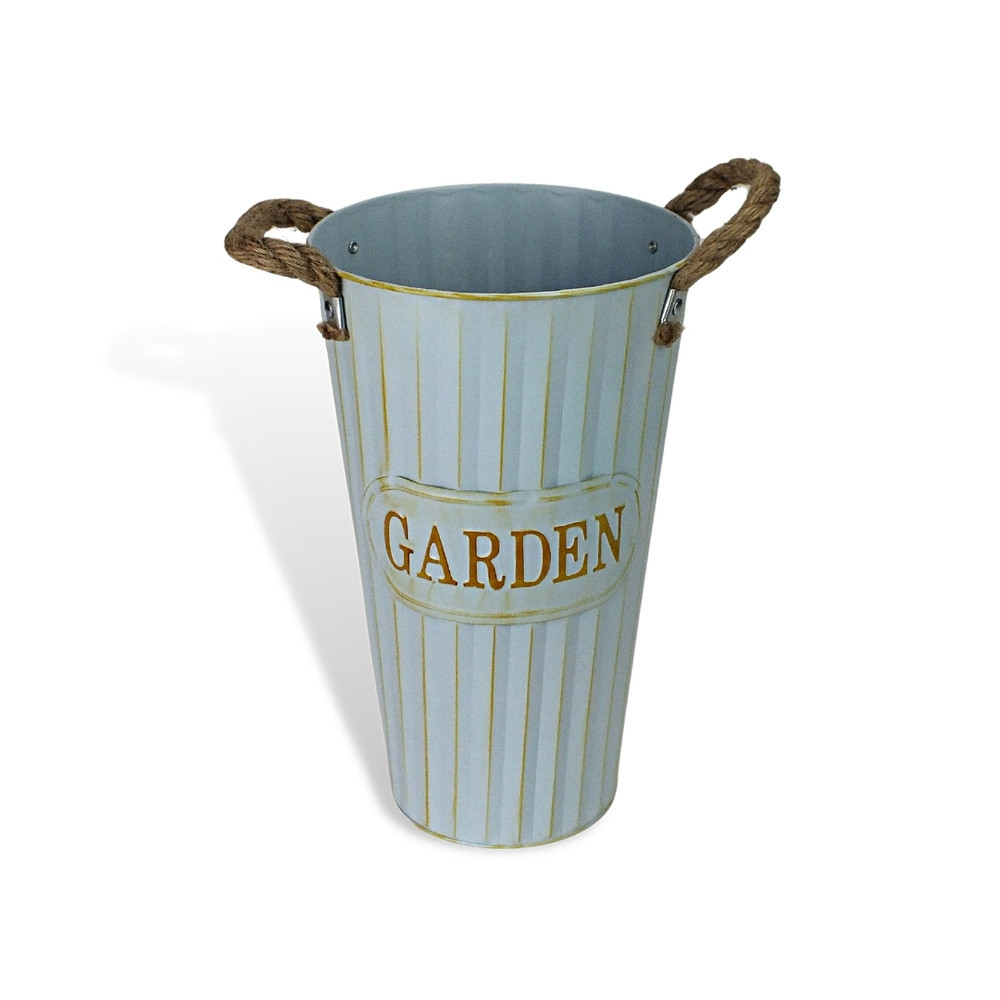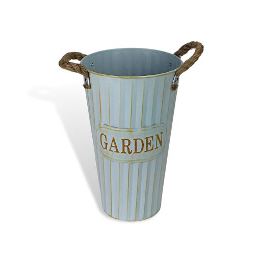 "Garden" feliratos magasított bádog váza, kötél fülekkel. Strapabíró, nagyobb csokrokat is könnyen befogadó virágtartó.Méret: 18x30cm, talp átmérő: 12cm, tető átmérő: 18cm. Felhasználható tároláshoz, virágcserép fedéshez és lakásdekorációhoz.