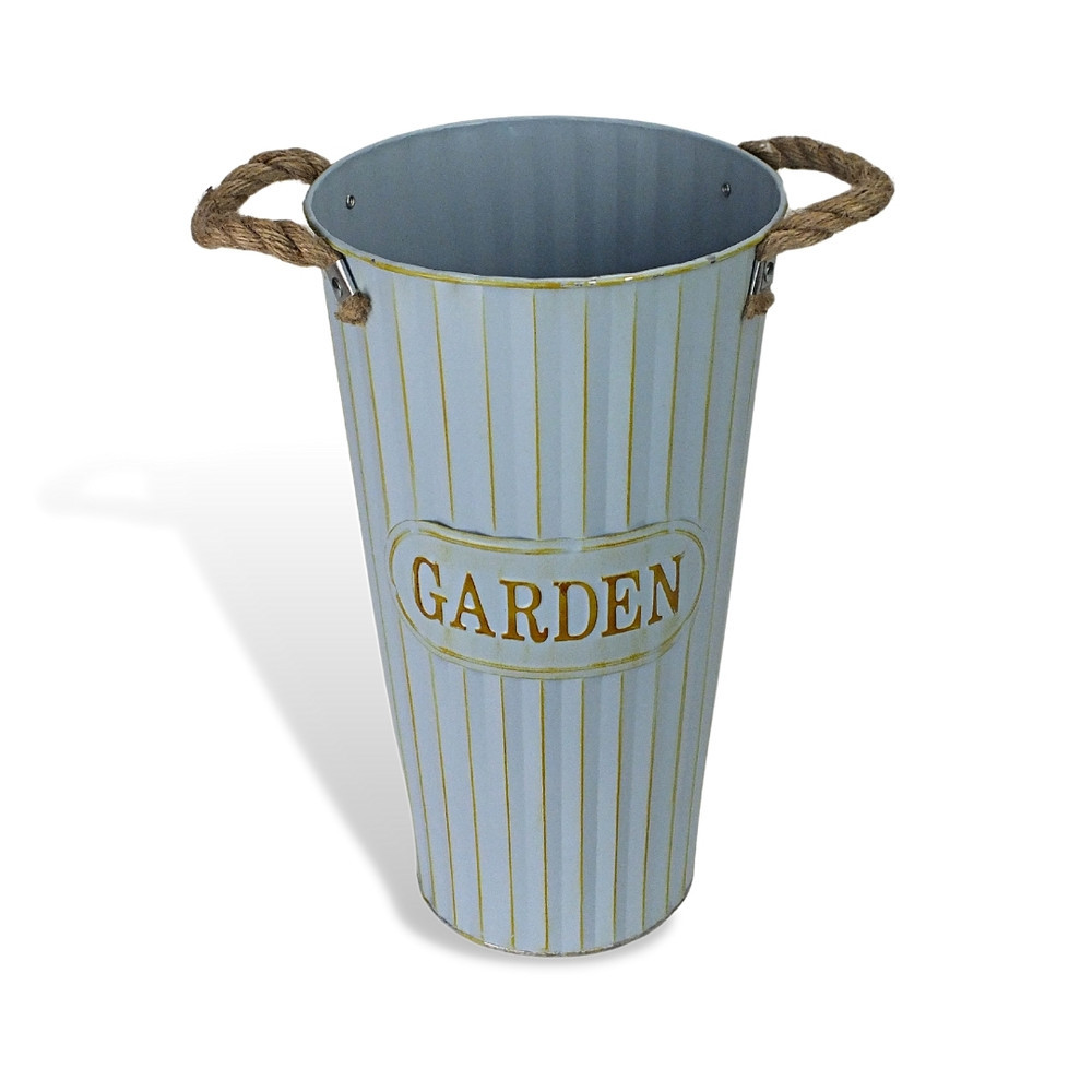 "Garden" feliratos magasított bádog váza, kötél fülekkel. Strapabíró, nagyobb csokrokat is könnyen befogadó virágtartó.Méret: 19x35cm, talp átmérő: 13cm, tető átmérő: 19cm. Felhasználható tároláshoz, virágcserép fedéshez és lakásdekorációhoz.