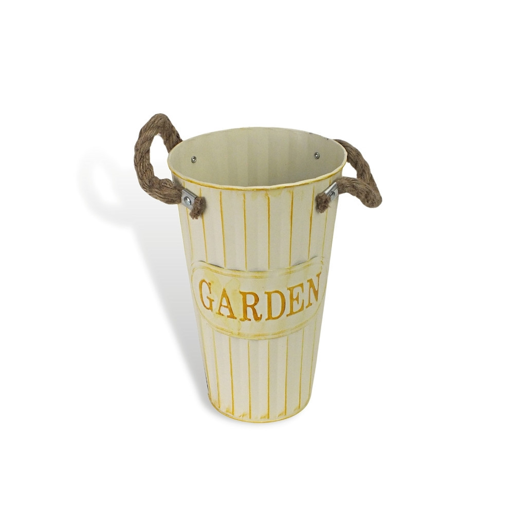 "Garden" feliratos magasított bádog váza, kötél fülekkel. Strapabíró, nagyobb csokrokat is könnyen befogadó virágtartó.Méret: 15x25cm, talp átmérő: 10cm, tető átmérő: 15cm. Felhasználható tároláshoz, virágcserép fedéshez és lakásdekorációhoz.