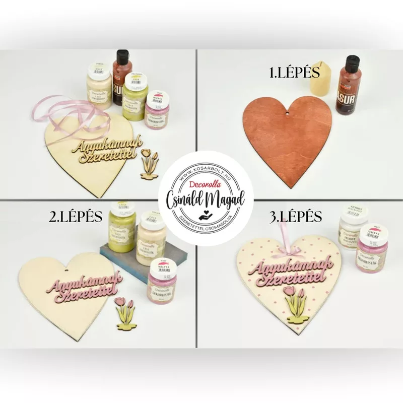 Anyák napi szív "Anyukámnak Szeretettel"A csomagban található termékek:• Natúr fa szív 1db (20x16cm)• Natúr fa - "Anyukámnak Szeretettel" felirat 1db• Natúr fa tulipán 1db• Szalag 0,5 méterAmire szükséged lesz és a csomagban NEM található:• Festék• Lazúr• Ecset és egyéb eszközök. Felhasználható anyák napi ajándékhoz és ünnepi dekorációhoz.