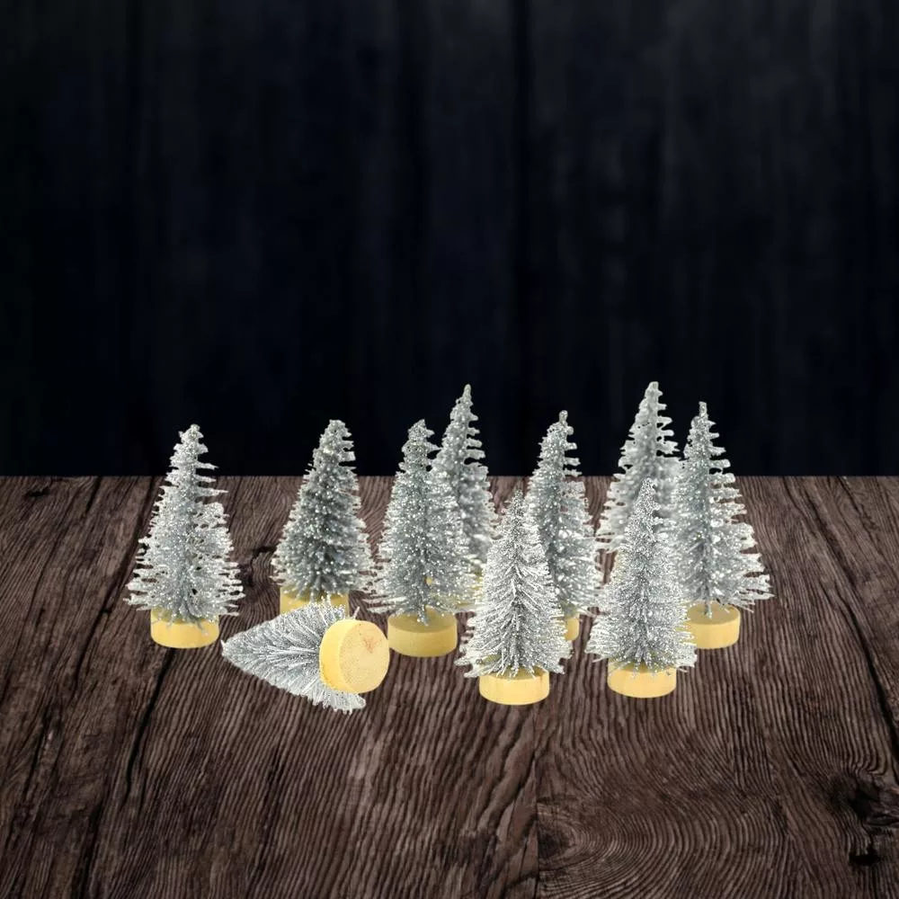 Dekor fenyőfa ezüst glitteres 4cm 10db/csomag – karácsonyi dekorációhoz és koszorúhoz