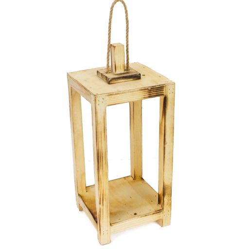 Égetett szélű, fa lanterna. A belsejében kialakított hellyel, az egyedi dekorációk és készítmények részére. Zárt tetejű, spárgával ellátott akasztóval. Kiváló választás fotózásokhoz, esküvőkre, természetbarátok számára díszítőelem, illetve kültéri eseményekre.Méretek: mag: 36cm, szél: 15x15cm. Felhasználható karácsonyi hangulatvilágításhoz és ünnepi dekorációhoz.
