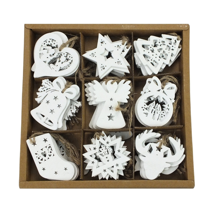 Fehér színű karácsonyfadíszek akasztóval ellátva. Egy egész fára elegendő szett! 9x6db vegyes karácsonyi díszek: szív, csillag, fenyő, harang, angyal, advent, csizma, hóember, szarvas.Méret: ~5cm. Felhasználható karácsonyfára és ünnepi dekorációhoz.