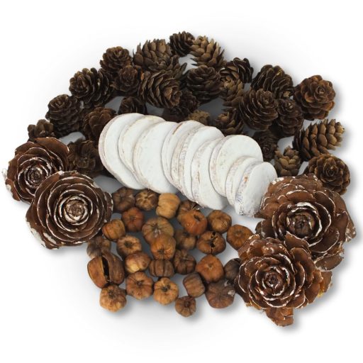 Természetközeli hangulatú termésválogatás, amely különböző formájú és méretű tobozokat, natúr tökbogyókat és fehérre festett fa szeleteket tartalmaz. Ideális választás őszi, téli vagy ünnepi dekorációk, koszorúk és asztali kompozíciók készítéséhez. Meleg, rusztikus hatásával az „Erdei mesék” terméscsomag minden alkotást természetes bájjal tölt meg.