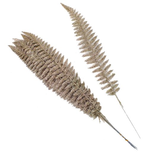 Csillámos pajzsika levelek otthoni vagy kirakati díszítéshez. Hosszú, keskeny ágakkal látványos eleme a dekorációnak.Méret: hossz: 55cm, szél: 8-10cm. Felhasználható virágdekorációhoz, koszorúhoz, asztaldíszhez és csokor