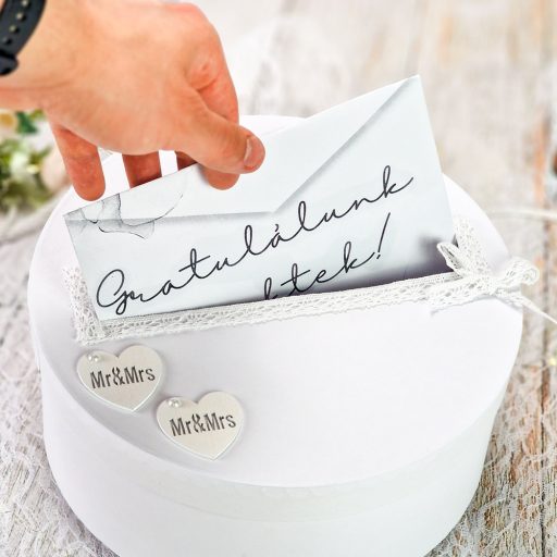 Esküvői persely fehér csipkés-szíves 25cm – esküvői dekorációhoz