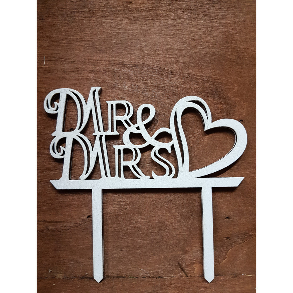 Fa - "Mr & Mrs" tortadísz szíves fehér 11,5cm – esküvői dekorációhoz