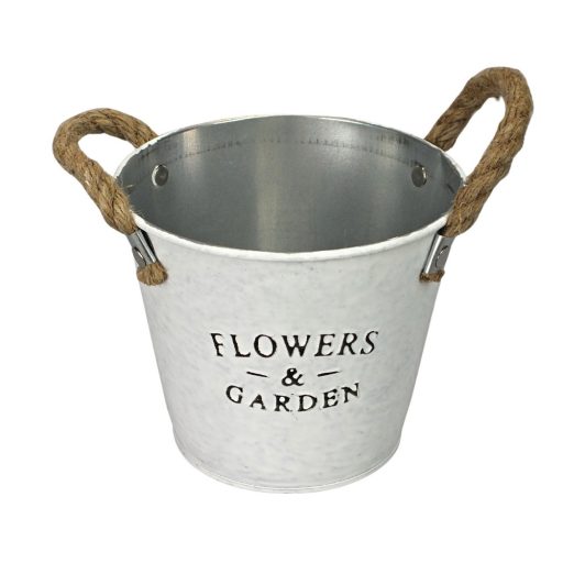 "Flowers & Garden" feliratos bádog kaspó, kötél fülekkel. Strapabíró virágtartó beltérre és kültérre egyaránt.Méret: 14x12cm, talp átmérő: 10cm, tető átmérő: 14 cm. Felhasználható tároláshoz, virágcserép fedéshez és lakásdekorációhoz.