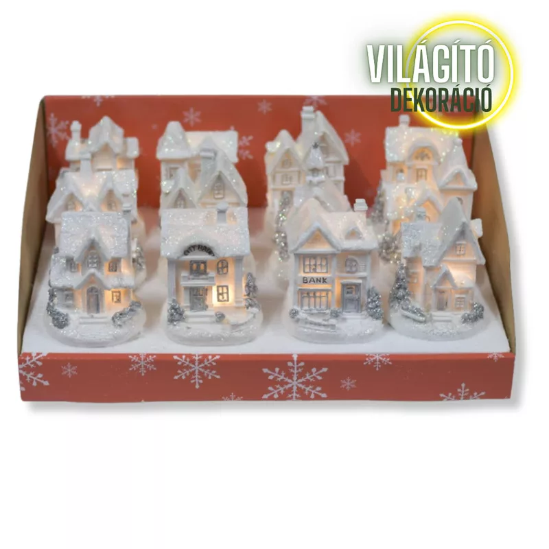 Fehér-ezüst világítós házikó kicsi 12db - OKOS ÁR! – karácsonyi dekorációhoz