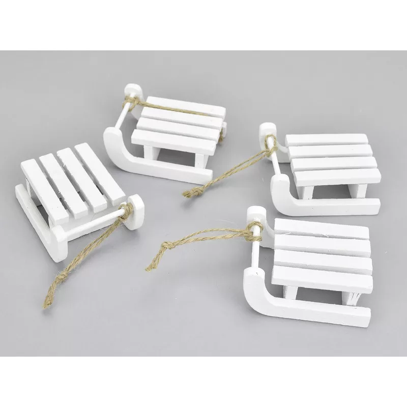 Fehér fa szánkó kicsi 6,5cm 4db/csomag – karácsonyi dekorációhoz