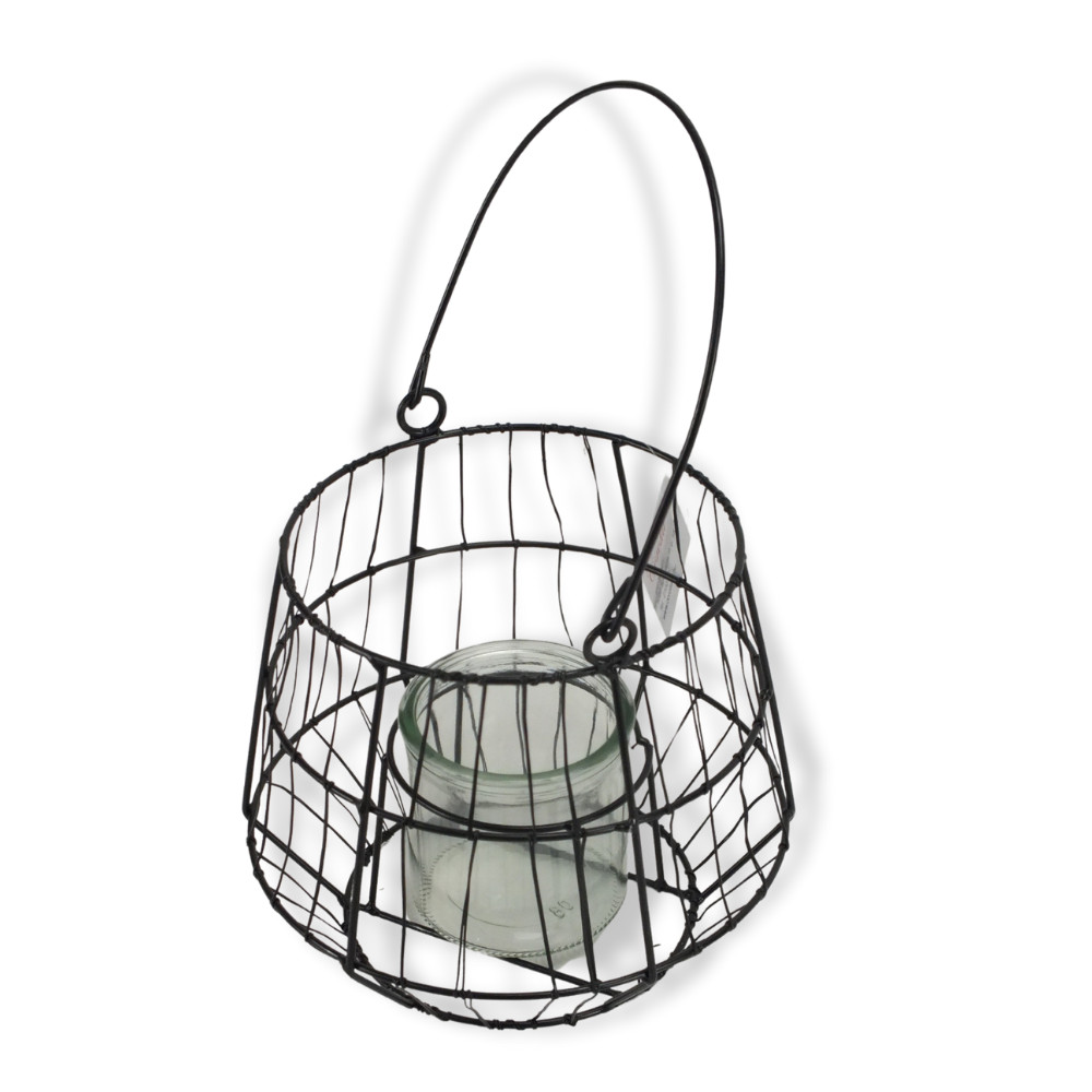 Fémből készült tartó, amelynek belsejében egy üveg található mécsesek elhelyezésére. Hangulatos kiegészítője lehet bármely otthonnak, terasznak vagy erkélynek. A fekete szín modern és időtálló megjelenést kölcsönöz, így könnyen illeszkedik bármilyen stílusú lakásdekorációhoz. Ideális választás mécsesek, teamécsesek elhelyezésére, különleges alkalmakra vagy mindennapi dekorációként.Méret: váz: 15x15cm, mag.: 15cm, mag. füllel 30cm üveg: átmérő: 7cm, mag: 8cm