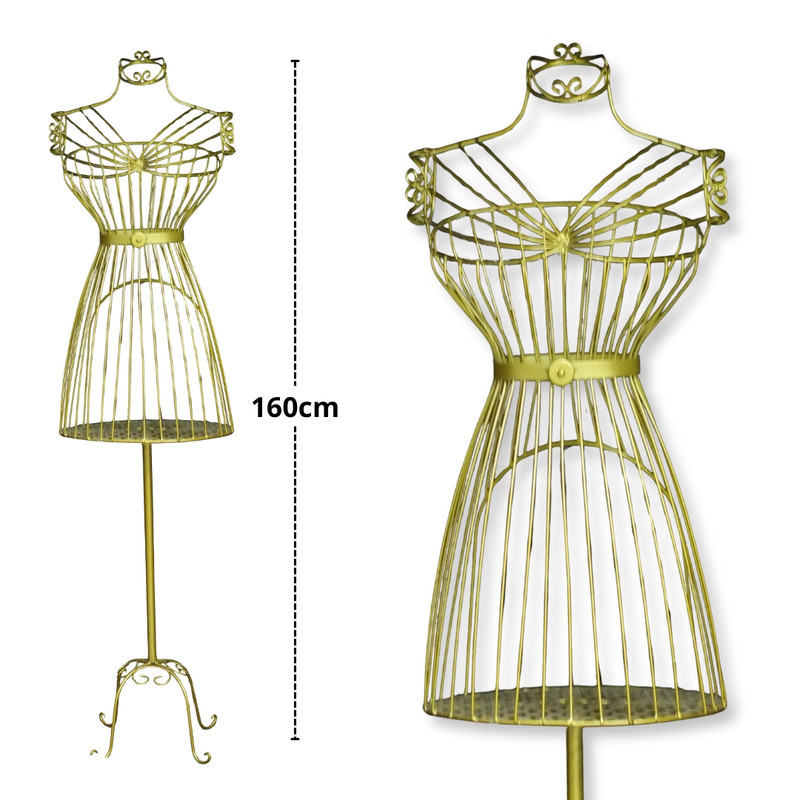 Ez a gyönyörű, arany színű, fémből készült próbababa eleganciát és fényűző megjelenést kölcsönöz bármely térnek. Látványos vonalvezetése és díszes részletei különleges hangulatot teremtenek, legyen szó ünnepi dekorációkról, bemutatóterekről, fotózási helyszínekről vagy exkluzív rendezvényekről.Kialakítása stabil, mégis légies, így önmagában is dekoratív elem, de könnyen kombinálható virágokkal, textíliákkal, fényfüzérekkel vagy bármilyen kreatív kiegészítővel.Felhasználási javaslatok:Esküvői dekorációként: virágkompozíciókkal, tülllel vagy fényfüzérrel díszítve.Kirakatba: elegáns installáció részeként, ruhák, ékszerek vagy kiegészítők bemutatásához.Fotóhátterekhez: látványos, romantikus dekorációs elemként.Rendezvényekre: tematikus események, bálok, divatbemutatók hangulatfokozó díszeként.Lakásdekorációként: vintage vagy glam stílusú otthonokba egyedi szobadíszként. Felhasználható esküvői és kerti parti dekorációhoz, asztaldíszhez.