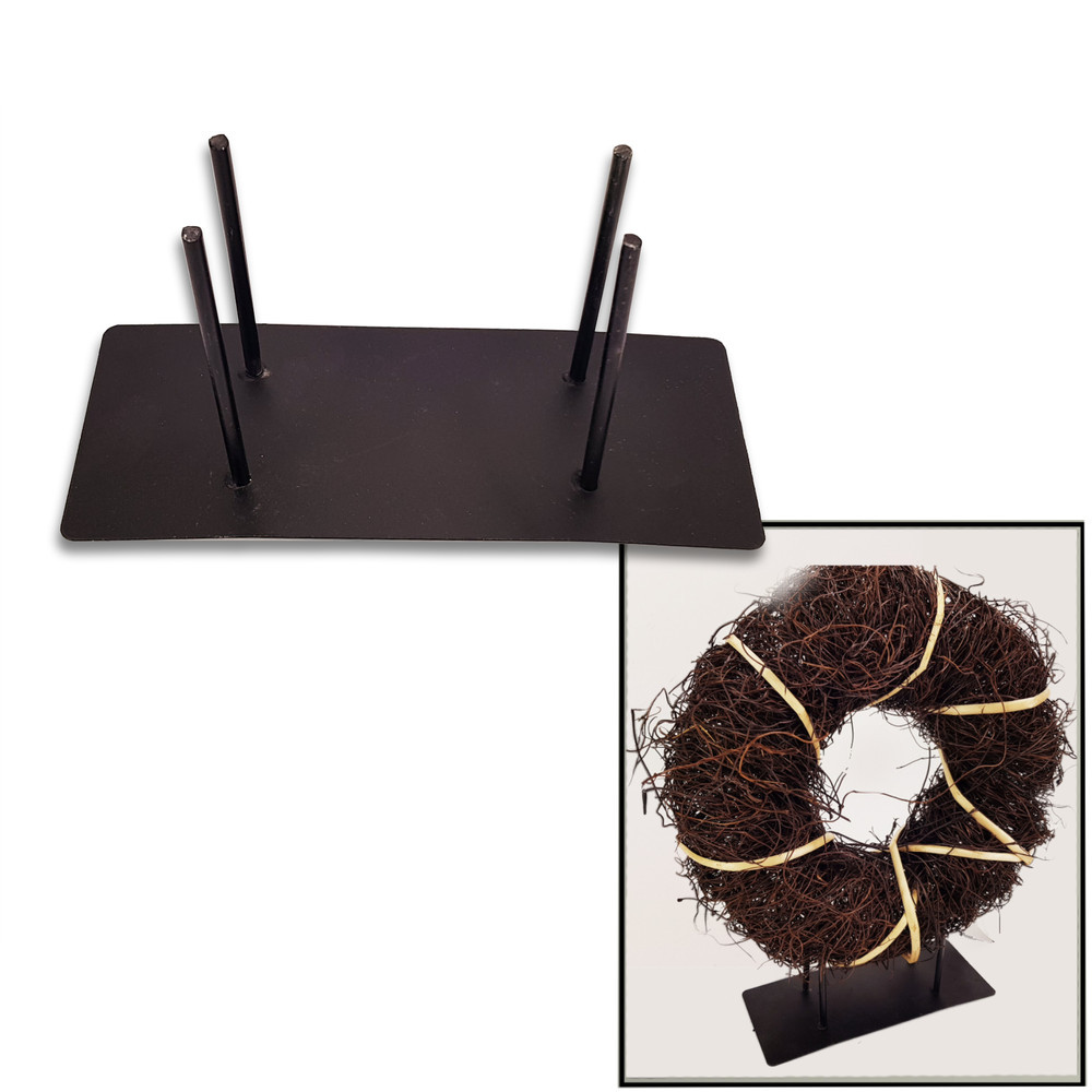 Fekete koszorútartó állvány fém talapzattal. Állított koszorút eddig csak falon és ajtón lehetett elhelyezni, de ezzel az elemmel szekrényre, vagy asztalra is tehetjük a díszünket.Mag: 10cm, szél.: 20x8cm. Felhasználható karácsonyi ajtódísz és asztaldísz készítéséhez.