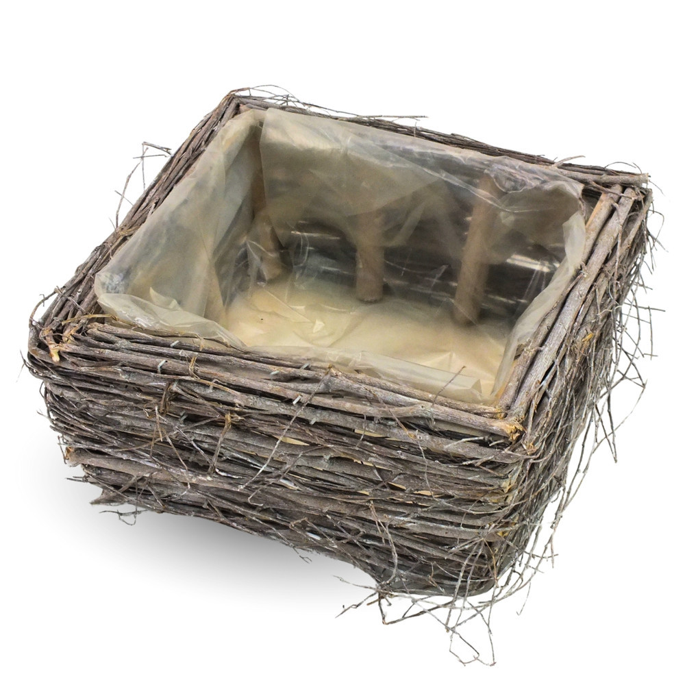 Természetes hatású, fonott indából készült négyzet alakú tál, keményfa aljjal és fóliabéléssel. Stabil szerkezetének és masszív fa alapjának köszönhetően tartós és könnyen kezelhető. Kiváló választás virágkötészeti kompozíciók, ajándéktálak vagy dekorációk készítéséhez. A fóliás bélés megvédi az anyagot a nedvességtől.Méret: 24 × 24 x 10cm. Felhasználható tároláshoz, virágcserép fedéshez és lakásdekorációhoz.