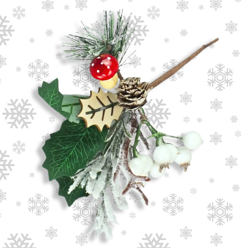 A gombás agancsos pick természetközeli hangulatot visz a téli dekorációkba.A részletgazdag, élethű mű elemek - a finom gomba, bogyók és az apró agancs - harmonikusan egészítik ki egymást, megidézve az erdei tájak melegségét és nyugalmát. Tökéletes választás koszorúkhoz, ajtódíszekhez, asztali kompozíciókhoz vagy más ünnepi dekorációkhoz.Méret: hossz: 19cm