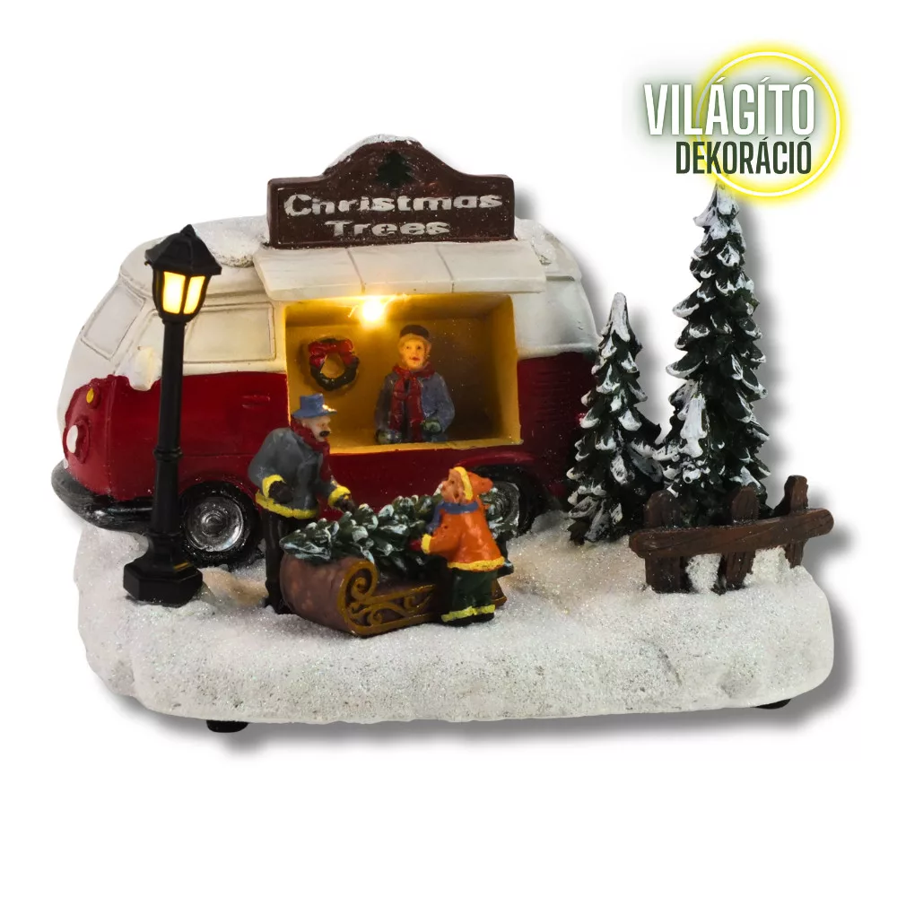 Hozd el otthonodba az igazi ünnepi hangulatot ezzel a bájos, retró stílusú karácsonyi jelenettel. A jelenet központi eleme egy karácsonyfát árusító kisbusz, előtte kis figurák, havas táj és fenyők. A meleg LED fény kiemeli a részleteket, így tökéletes dekoráció az ünnepi asztalra vagy polcra.Megjegyzés: a működéshez 3 db AA elem szükséges, amely nem része a csomagnak.Méret: 18x14x12cm