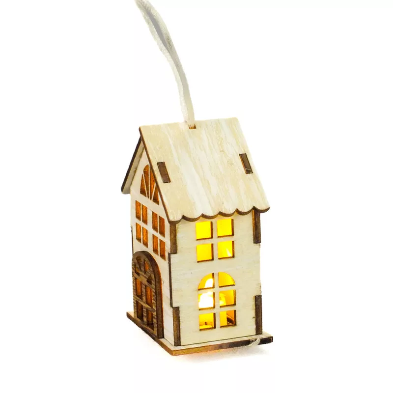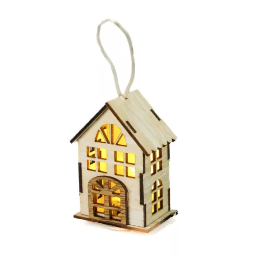 Mini, világítós faház akasztóval, ajtó- és asztaldíszbe vagy karácsonyfára.Méret: 5,5x4x8cm3db 1,5V LR1130as elemmel működik. Felhasználható karácsonyi asztaldíszhez, koszorúhoz és ünnepi dekorációhoz. Festéssel, ragaszt