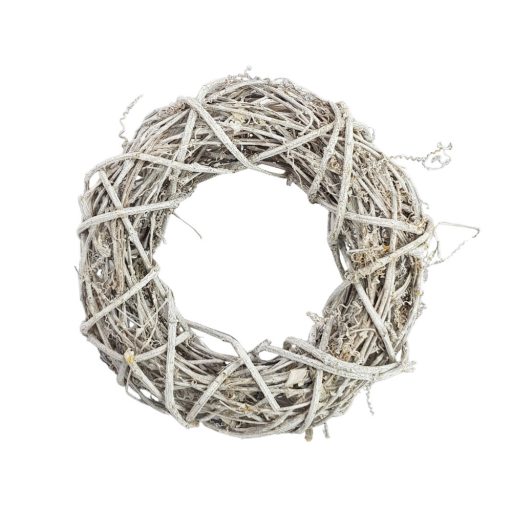 Erős anyagú, szürke gallyakból készített, kör alakú koszorú fém vázon, dekorációs kellék.Koszorú méret: 24cm, vast.: kb.70mm- Karácsonyi koszorú - Ajtókopogtató - asztali koszorú - asztaldísz - Adventi koszorú -. Felhasználható karácsonyi ajtódísz és asztaldísz készítéséhez.