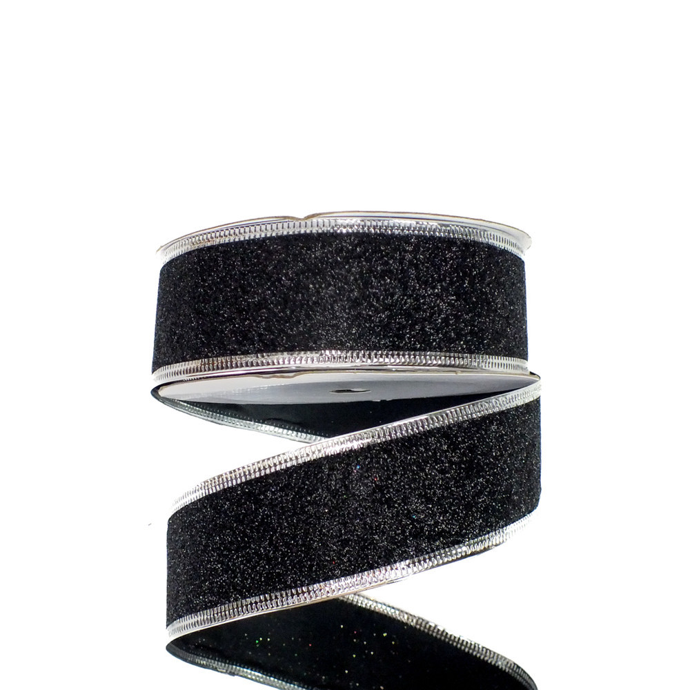 Karácsonyi szalag glitteres - fekete, drótos szegéllyel – karácsonyi díszítéshez és dekoráláshoz