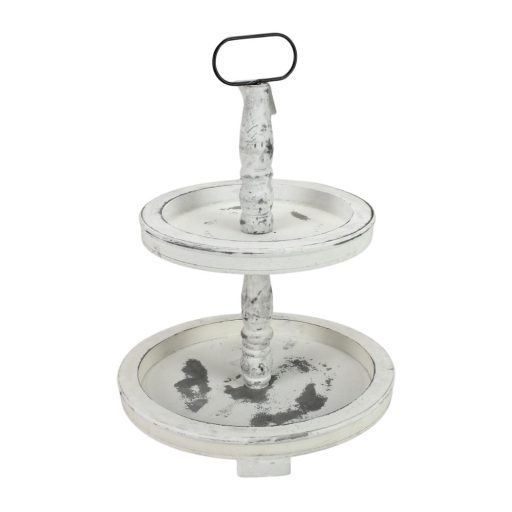 Kétemeletes kopott fehér emeletes kínáló tál. Fém vázzal, fa tálcákkal a kiváló és időtálló minőségért. Rusztikus de elegáns megjelenéssel. Édességek, gyümölcsök és sütemények felszolgálásához egyaránt alkalmas. Illetve bolti, kirakati és otthoni kompozíciók dekorációs emelvényének. Méretei: mag. kb.: 45cm, szélesség: 33cmAlsó tálca: átmérő: 33cm, magasság: 2,8 cm, mélység: 2cmFelső tálca: átmérő: 26cm, magasság: 2,8 cm, mélység: 2cm