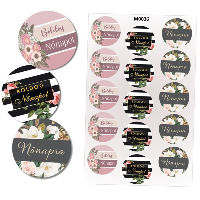 Matrica - Boldog nőnapot kerek matricák 15db/lap – húsvéti dekorációhoz