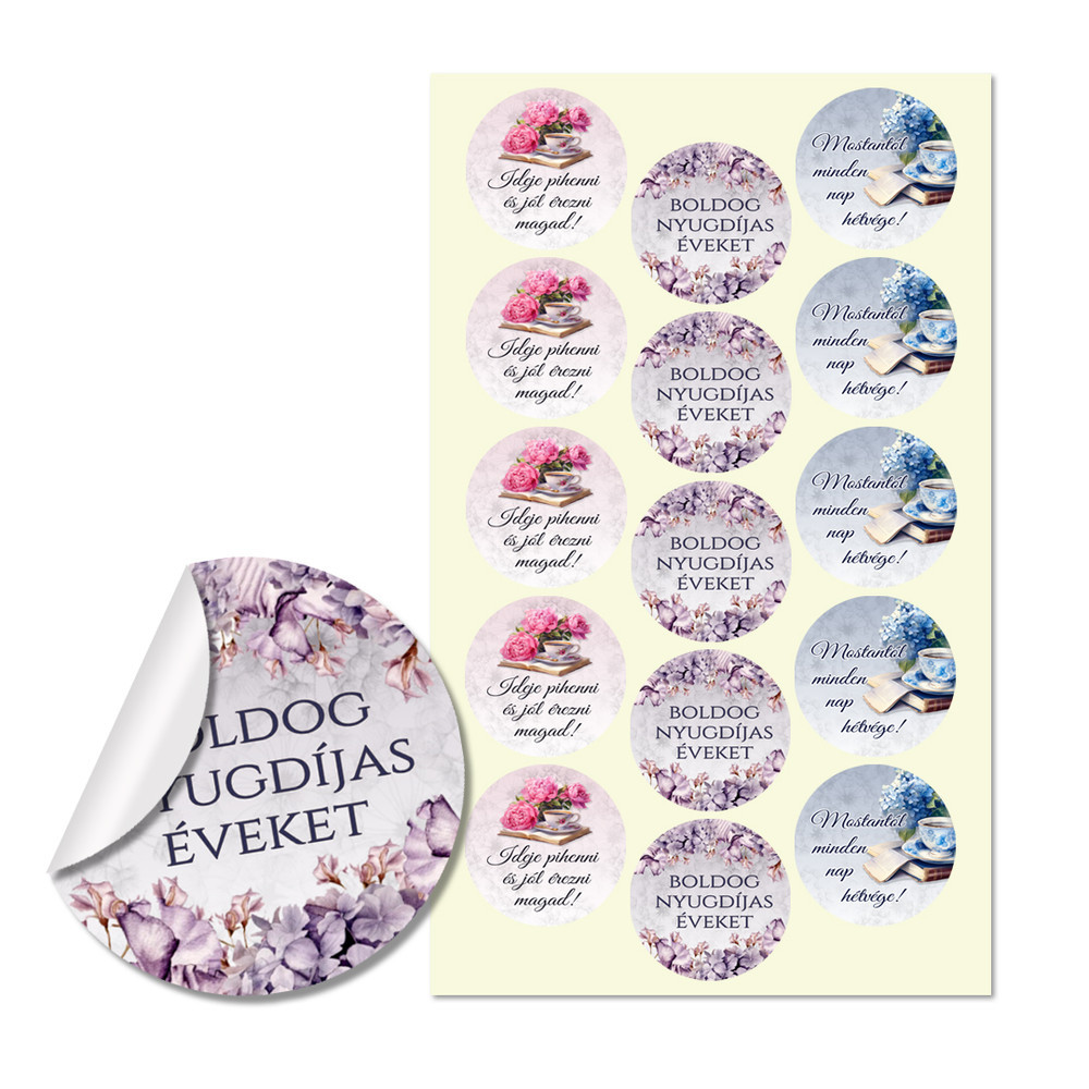 Matrica - Nyugdíjas kerek matricák 15db/lap – kreatív hobby projektekhez