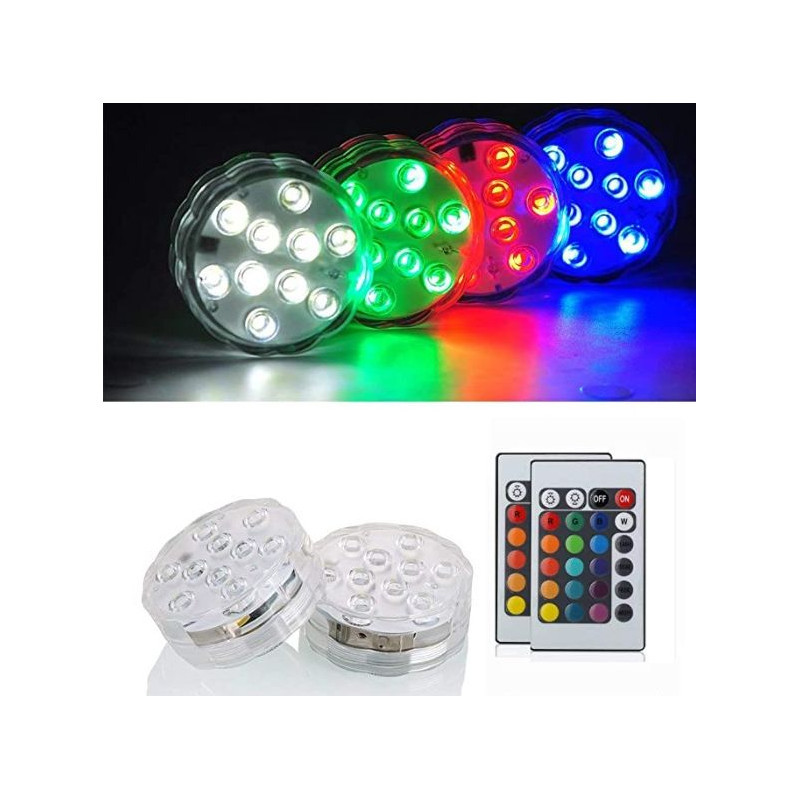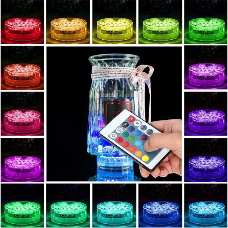 Egyedi otthoni dekorációként, vagy profi esküvői világítástechnikához használható vízálló LED korong.Használható még medencébe, kerti tóba, fürdőkádba, jacuzziba, szökőkútba, jégvödörbe, akváriumba, vázába szárazon és vízben.4db, minden koronghoz külön távirányító.Tulajdonságok: Vízálló, távirányítóval irányítható. Cserélhető színek.Színpalettája 12+1 színből áll. Gombnyomásra állítható fényerő.Emellett 5 különböző világítási funkció is elérhető. Egyéb jellemzők: 3db AAA elemmel működik, 10db LED fényÁtmérő: 7cm, magasság: 2,5cm. Távirányító hatótáv: 5-6 méter.Vízállóság: IP68 tanusítvány