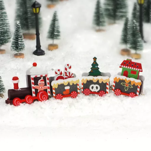 A kis fa vonat tökéletesen illeszkedik a karácsonyi dekorációk közé, hiszen a klasszikus dizájnnak köszönhetően időtálló szépséget kölcsönöz a terített asztalnak vagy a kandalló párkányának. Az ideális méretének köszönhetően könnyen elfér az ünnepi asztalon anélkül, hogy túl sok helyet foglalna, ugyanakkor elég markáns ahhoz, hogy megállja a helyét mint dekoratív központi elem.