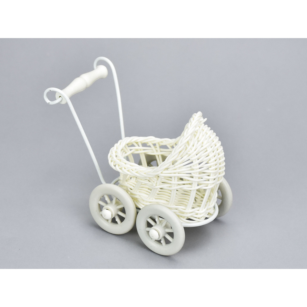 Műanyag Babakocsi Kosár mini virágoknak, ékszereknek, vagy kirakati tárgyként. Felhasználható esküvői és kerti parti dekorációhoz, asztaldíszhez. Virágokkal, szalaggal és egyéb ünnepi kellékekkel kombinálható.