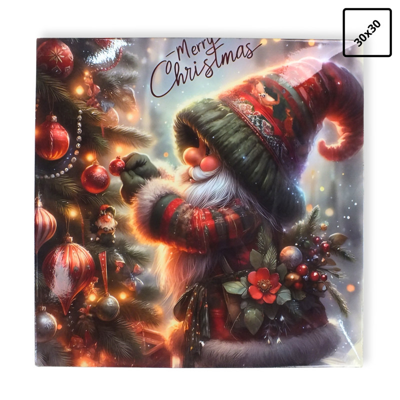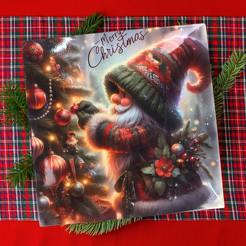Műanyag négyszögletű tálca Karácsonyfát díszítő manó 30x30cm – koszorúkészítéshez és ajtódíszhez
