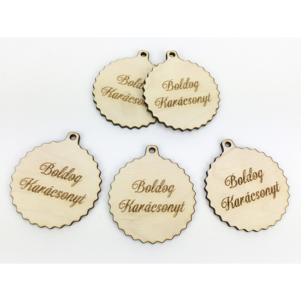 Natúr fa - "Boldog Karácsonyt" fodros gömb nagy 5db/csomag – karácsonyi koszorúhoz és asztaldíszhez