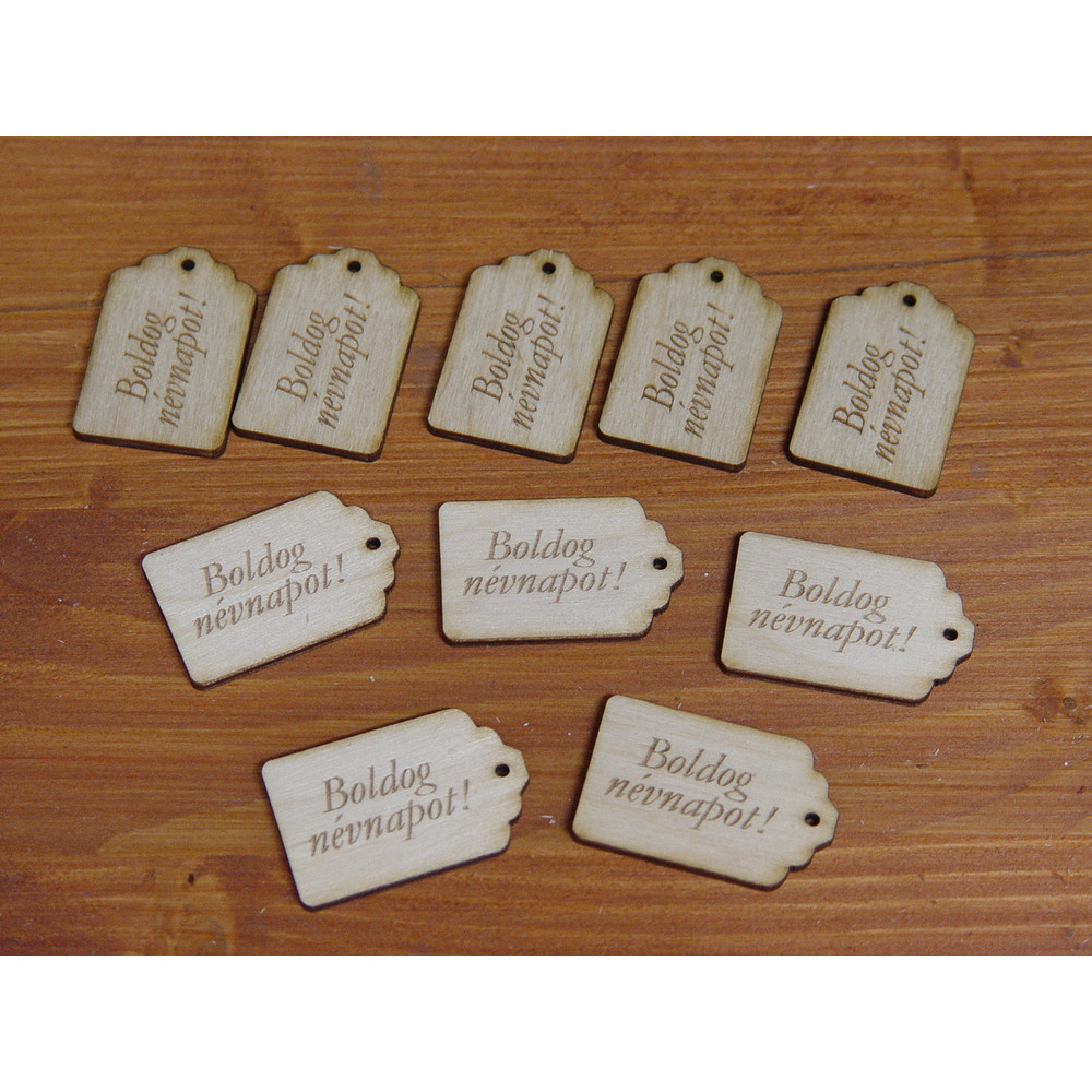 Natúr fa - "Boldog Névnapot" gravírozott scrapbook táblák 3x4,5cm 10db/csomag – ajándékcsomagoláshoz és ünnepi dekorációhoz